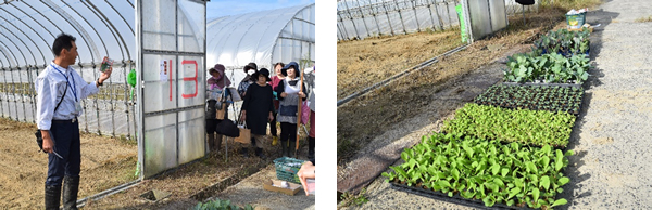 10月7日「はじめての野菜作り教室」は秋冬野菜の栽培を始めました。鳥屋育苗センターのハウスを利用し、野菜作りを基礎から学んでいる12名が参加しました。
