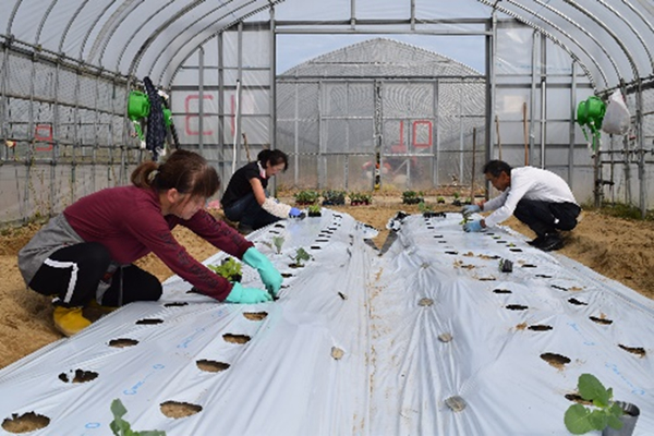 参加者は肥料をまいた後、2列の畝を耕して整形し一つの畝には白黒マルチを張り白菜と茎ブロッコリーを互い違いになる千鳥植えで定植しました。